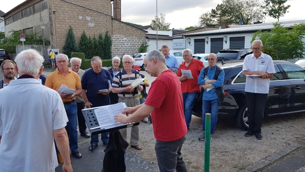 Der Ortsausschussvorsitzende Walter Omsels hatte uns eingeladen, den Mai nach der Pandemie mit der Ortsgemeinde musikalisch zu begrüßen. Gerne kamen wir der Einladung nach und sangen auch hier gut 30 Minuten Lieder zum Mai, von Rhein und Wein.