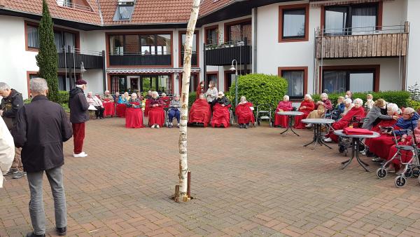 So lauschten die Bewohner durch geöffnete Fenster unserem Gesang. Zurück in den Innenhof gelangte zu uns Sängern der Applaus als besonderer Dank. Es hat uns und den Bewohnern viel Freude bereitet, sodass ein weiterer Auftritt in Zukunft von uns erwartet wird.