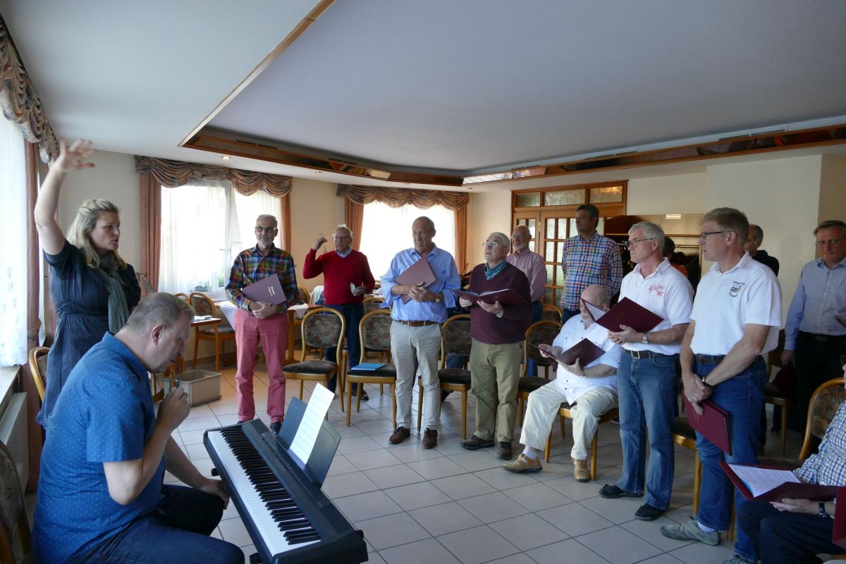Am Samstag, 21.09., pünktlich um 9 Uhr begann für uns Sänger, wir waren fast vollzählig eingetroffen, im Westerwald unser Intensivprogramm. Mit Frau Wibke Anton, Stimm- und Sprechcoaching-Trainerin, hatten wir wieder eine kompetente Fachkraft an unserer Seite, die uns lehrte und überzeugte, durch gezielte Übungen und Stimmabläufe, durch bestimmte Atemtechnik und bewusstes Atmen dazu in entsprechender Körperhaltung und Körperspannung während des Singens und bei den Konzertauftritten, das Publikum mit einzubeziehen und zu fesseln. Voraussetzung dazu sind natürlich beim Vortrag Text- und Notensicherheit und selbstbewusstes Auftreten der Sänger. Die Zeit mit Frau Anton, die uns auf viele Fehler aufmerksam machte und kompetent versuchte, diese auszumerzen, verging wie im Fluge, zumal sie stets überzeugend und empathisch uns ihre Ansichten vermittelte. Mit großem Applaus quittierten wir Sänger, die von ihren Ausführungen profitieren, ihren engagierten Einsatz.