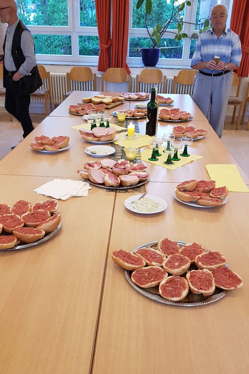 Marianne und Peter Werner Dung bedankten sich bei den Sängern an diesem Abend für die Mitwirkung des Männerchores zu ihrer Eisernen Hochzeit.Während die Sänger noch für das Konzert am 06.10.2019 probten, waren einige Helfer um Marianne damit beschäftigt, den Umtrunk vorzubereiten. „Jet ze süffele on zu schnüffele“ sollte es geben. Neben diversen Getränken hatte das Team belegte Brötchen vorbereitet. Gerne naschten wir von diesen Gaben und sagen Danke für einen schönen Abend.