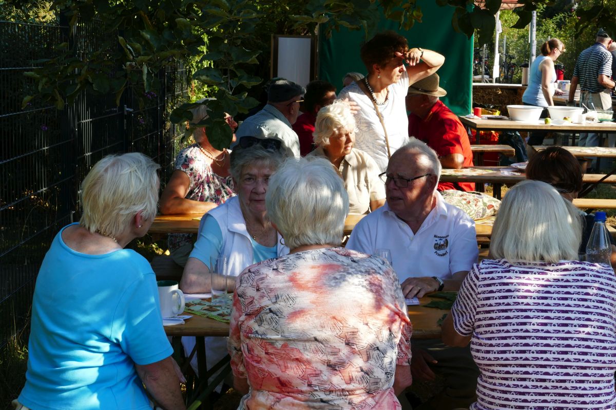 Zum Weinfest in den schönen Wiesengrund in Friesdorf hatte zum 31.08.2019 der Männerchor Friesdorf geladen. Gut vorbereitet von den Sängern, kamen bei Sonnenschein die ersten Gäste bereits gegen 15:30Uhr und erfreuten sich an Kaffee und selbstgebackenem Kuchen. Es war ein warmer Tag, sodass sich die Gäste lieber im Schatten der Apfelbäume aufhielten als im sonnendurchfluteten Zelt. Aber der Abend brachte kühlere Temperaturen und so schmeckten dann auch Zwiebelkuchen mit Federweißer, Würstchen und Steak bei leckerem Wein von der Ahr und Rheinhessen. Wer keinen Wein mochte, konnte bei alkoholfreien Getränken oder Stubbi die Geselligkeit pflegen. Der Männerchor Friesdorf freute sich an diesem Tag über die vielen Gäste, die bei bester Stimmung den Nachmittag und Abend auf der Festwiese verbrachten. Gegen 23:30Uhr konnte dann doch der Abbau von Gerätschaft und Zelten begonnen werden.
