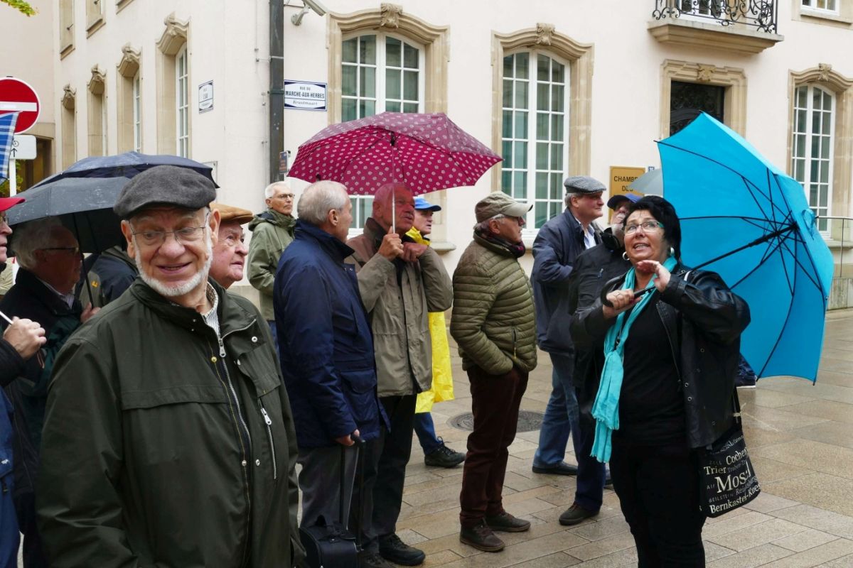 Heute, kurz vor acht, startete die mit 16 Mann deutlich reduzierte Sängerschar mit unserem Busfahrer und Freund Klaus Dogen vom Friesdorfer Klufterplatz Richtung Luxemburg. Nach dem Zustieg unserer Reiseleitung an der Autobahn nahe Wittlich trafen wir gegen Mittag wie geplant in Luxemburg ein. Nach ein paar Liedern aus unserem Konzertprogramm im Pavillon auf dem Marktplatz, Schuberts „Heilig“ in der Pfarrkirche St.Michael, trafen wir uns zum gemeinsamen Mittagstisch im Restaurant Le Petrusse. Die anschließende „Citytour“ mit unserer temperamentvollen Führerin Plateau Kirchberg, Kasematten, Goldene Frau u.v.m. endete mit der Weiterfahrt (leider Autobahn wegen Straßenbau im Müllerthal) nach Echternach. Die Führung in der röm. Basilika St.Wilbrord und dazu passend wieder Schuberts „Heilig“ waren ein weiterer Höhepunkt  an diesem Sonntag. Nach individueller Freizeit mit Kaffee und Kuchen beendeten wir die Rückfahrt  kurz nach 19 Uhr mit dem Einkehrschwung  bei Sanja. Das Resthäufchen (9) Sänger ließ den, trotz leichtem Regen und Wolken schönen Ausflug, bei dem gewohnt guten Essen und ein paar Bierchen ausklingen.