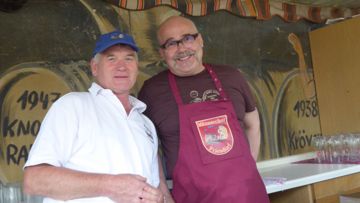Zum Weinfest in den schönen Wiesengrund in Friesdorf hatte zum 31.08.2019 der Männerchor Friesdorf geladen. Gut vorbereitet von den Sängern, kamen bei Sonnenschein die ersten Gäste bereits gegen 15:30Uhr und erfreuten sich an Kaffee und selbstgebackenem Kuchen. Es war ein warmer Tag, sodass sich die Gäste lieber im Schatten der Apfelbäume aufhielten als im sonnendurchfluteten Zelt. Aber der Abend brachte kühlere Temperaturen und so schmeckten dann auch Zwiebelkuchen mit Federweißer, Würstchen und Steak bei leckerem Wein von der Ahr und Rheinhessen. Wer keinen Wein mochte, konnte bei alkoholfreien Getränken oder Stubbi die Geselligkeit pflegen. Der Männerchor Friesdorf freute sich an diesem Tag über die vielen Gäste, die bei bester Stimmung den Nachmittag und Abend auf der Festwiese verbrachten. Gegen 23:30Uhr konnte dann doch der Abbau von Gerätschaft und Zelten begonnen werden.