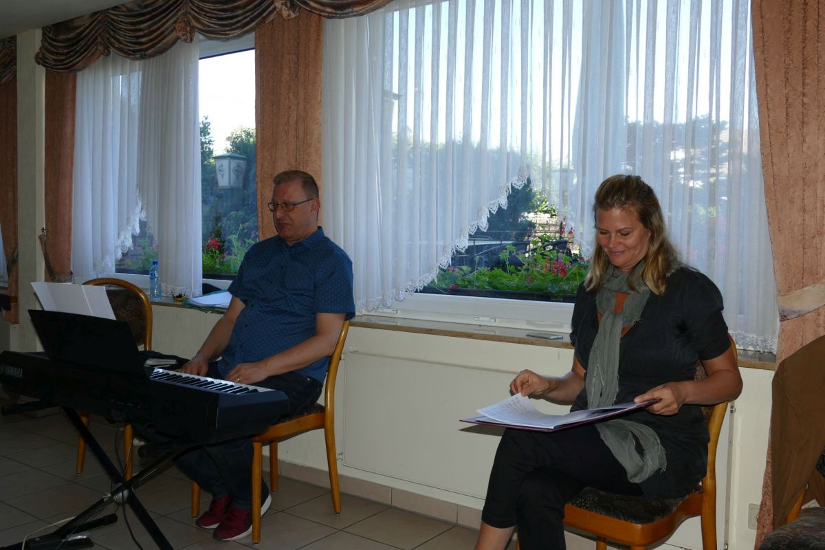 Am Samstag, 21.09., pünktlich um 9 Uhr begann für uns Sänger, wir waren fast vollzählig eingetroffen, im Westerwald unser Intensivprogramm. Mit Frau Wibke Anton, Stimm- und Sprechcoaching-Trainerin, hatten wir wieder eine kompetente Fachkraft an unserer Seite, die uns lehrte und überzeugte, durch gezielte Übungen und Stimmabläufe, durch bestimmte Atemtechnik und bewusstes Atmen dazu in entsprechender Körperhaltung und Körperspannung während des Singens und bei den Konzertauftritten, das Publikum mit einzubeziehen und zu fesseln. Voraussetzung dazu sind natürlich beim Vortrag Text- und Notensicherheit und selbstbewusstes Auftreten der Sänger. Die Zeit mit Frau Anton, die uns auf viele Fehler aufmerksam machte und kompetent versuchte, diese auszumerzen, verging wie im Fluge, zumal sie stets überzeugend und empathisch uns ihre Ansichten vermittelte. Mit großem Applaus quittierten wir Sänger, die von ihren Ausführungen profitieren, ihren engagierten Einsatz.